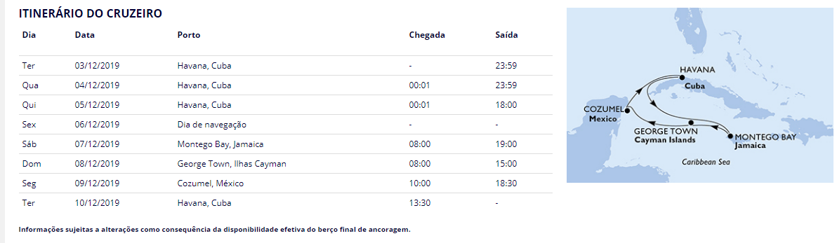 O navio chegará em Havana às 13h30. Após o desembarque, será feito o traslado para o aeroporto.